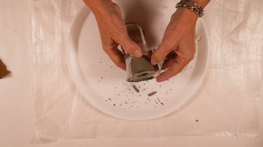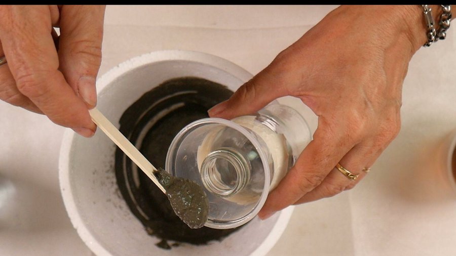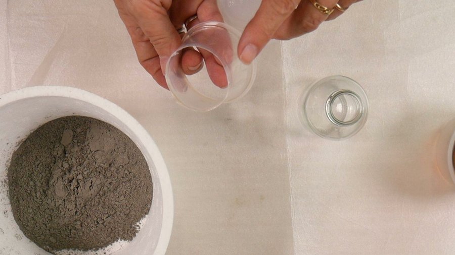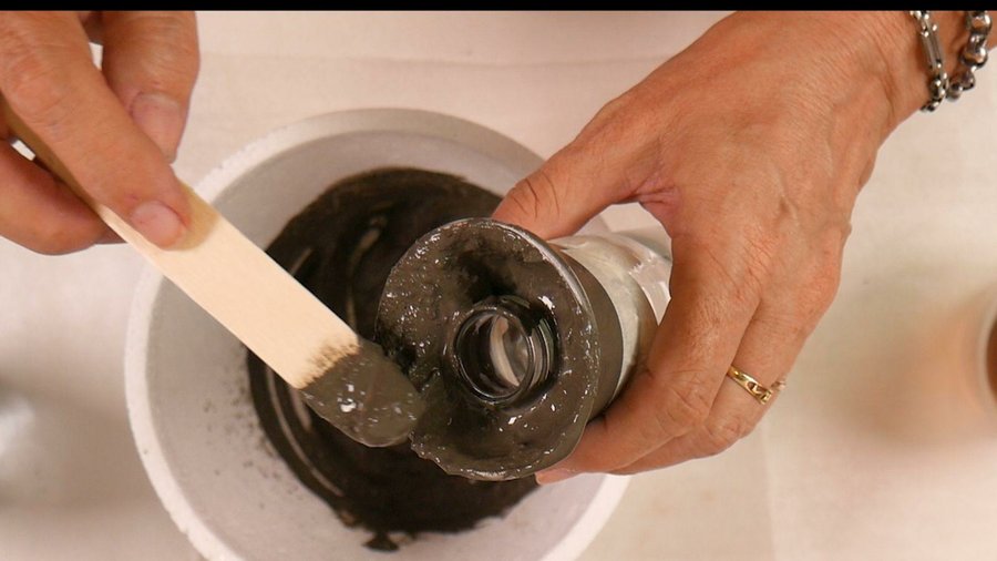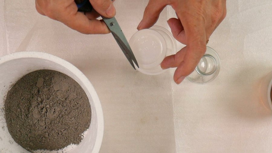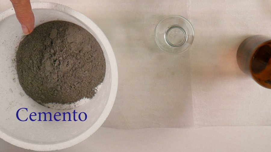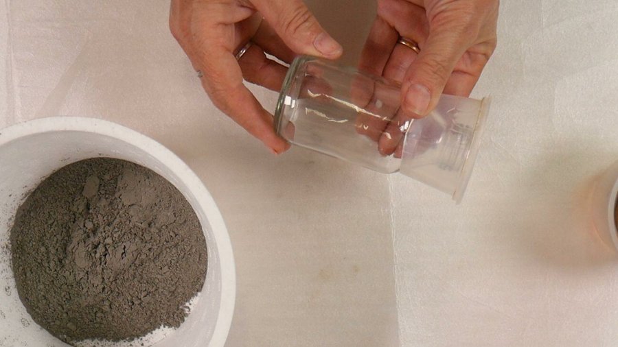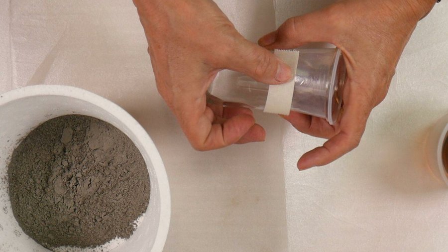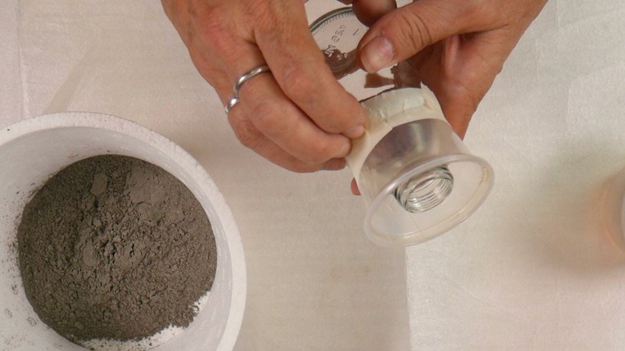 Agrego agua de a poco sobre el cemento hasta formar una pasta que la pueda levantar con la espátula, y con esta misma espátula introduzco la mezcla entre el vaso de plástico y la boca del frasco, evitando que caiga dentro del mismo y rellenando todo este interior.