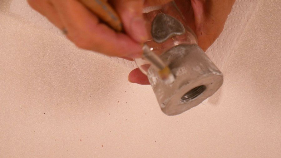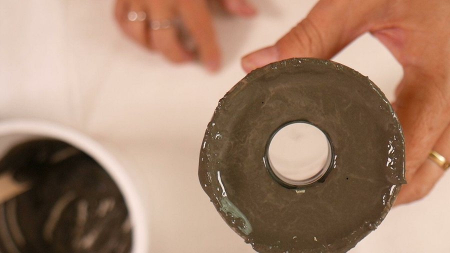 Lo ubico por encima del frasco, hasta que hace tope con el vidrio, quedando la boca del frasco por dentro, y lo uno al mismo con cinta de papel, alrededor asegurándome que queda bien pegada, bien sellada para que no filtre el cemento que colocaré dentro.