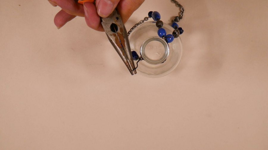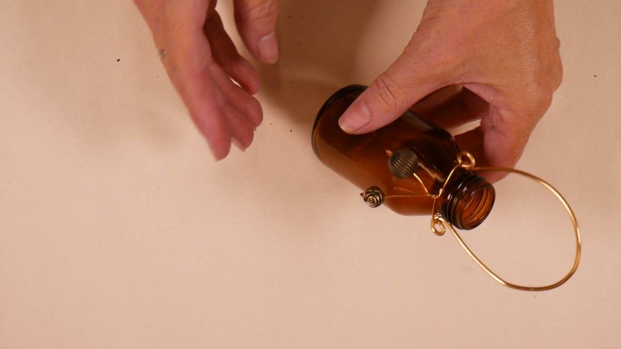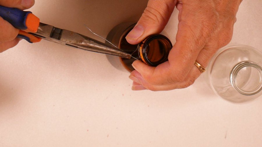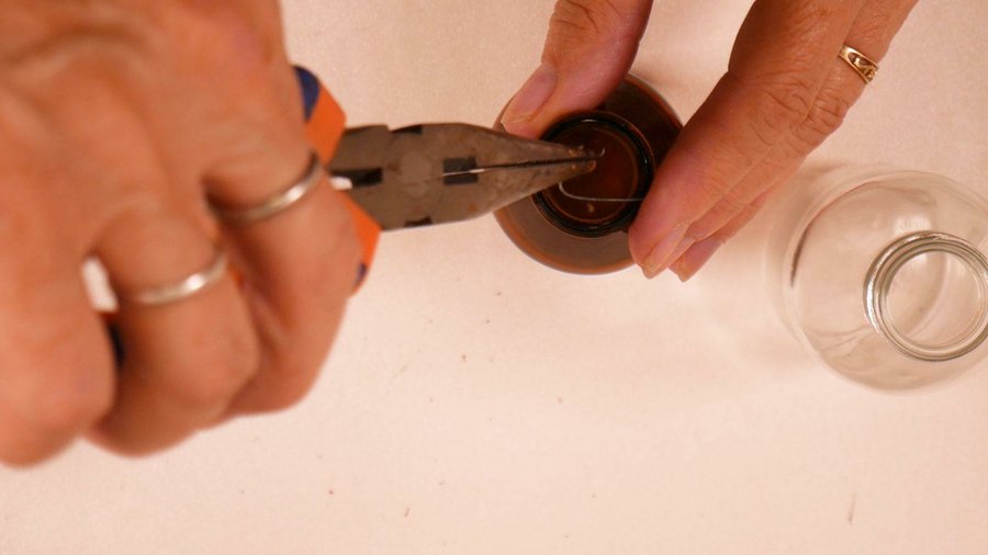 La segunda idea es realizar lámparas de aceite.Además de los frascos vamos a necesitar un alambre finito que envolveremos alrededor del cuello del frasco y lo retorcemos con una pinza para unirlo y dejamos un trozo más largo que luego subiremos hasta la boca del frasco y lo doblaremos hacia ella .