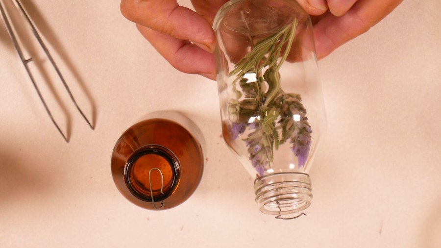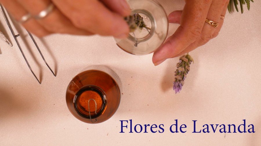 Y en el frasco incoloro colocaré las florecitas de lavanda y hojas que le dan aroma al aceite además de que quede más vistoso.
