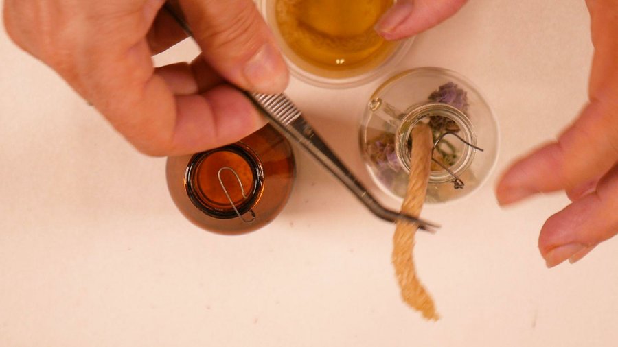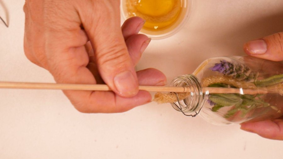 Una vez que la mecha o pabilo esta bien impregnado la voy a colocar dentro del frasco sujetando la parte superior con el alambre para que no toque la boca del frasco y empujo la mecha hacia el fondo.