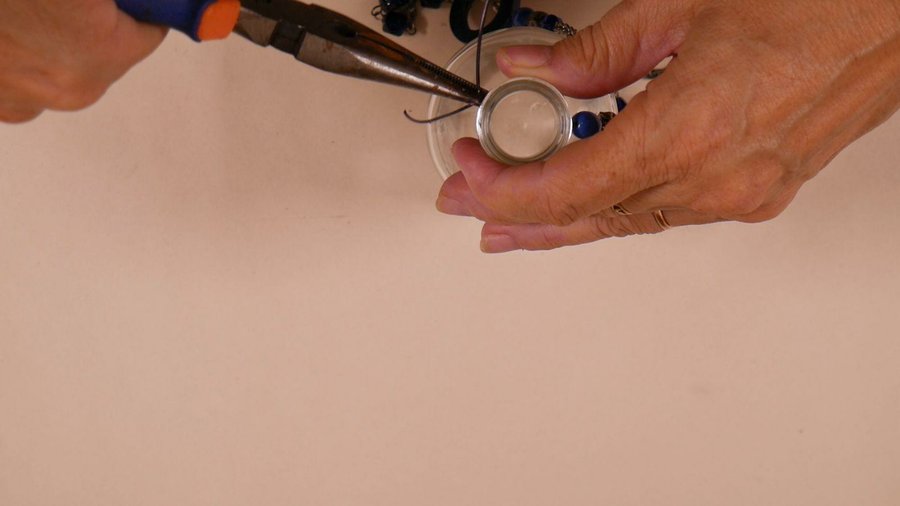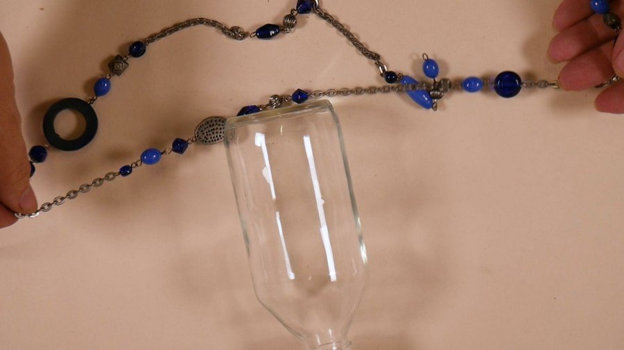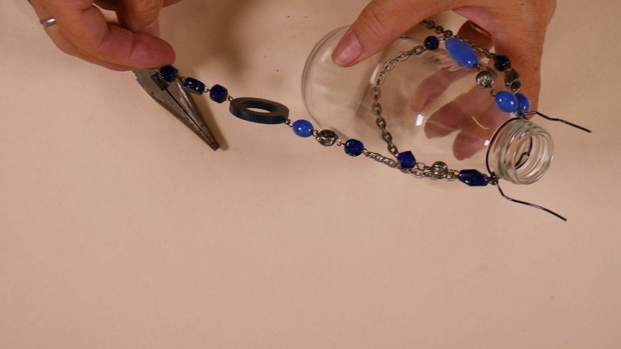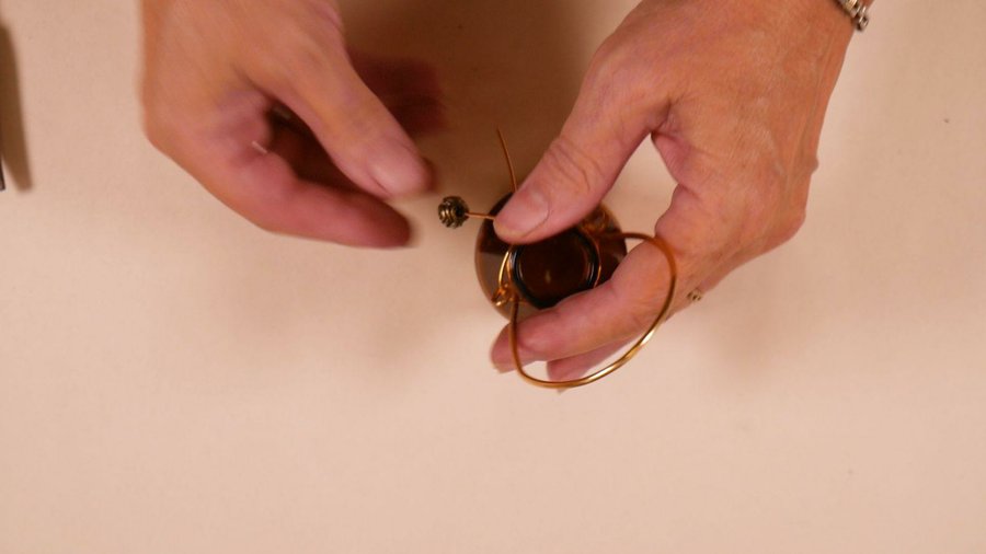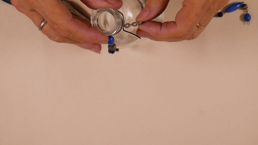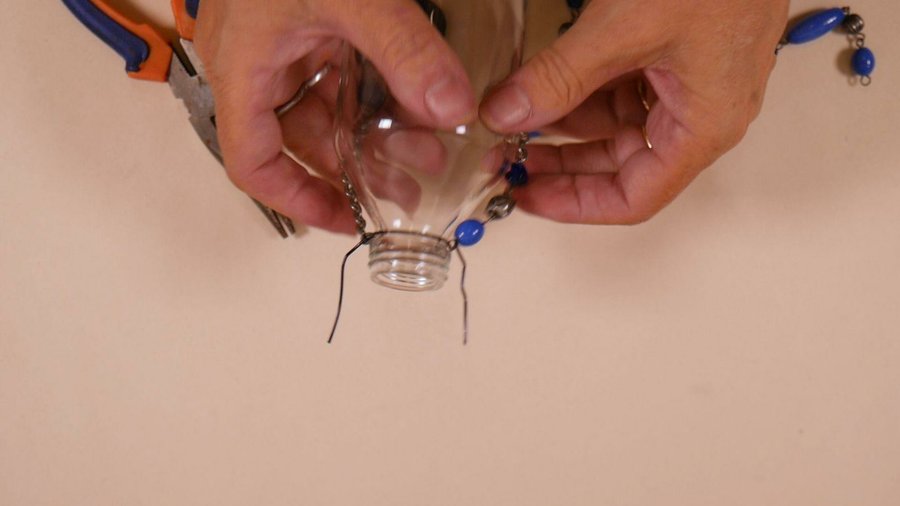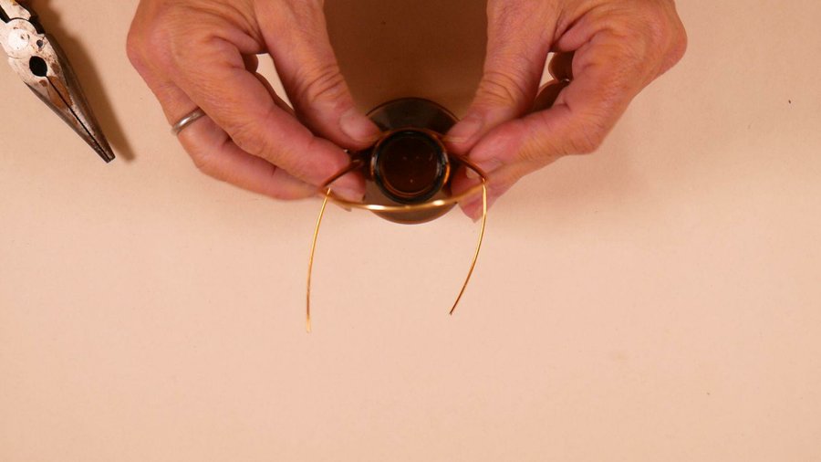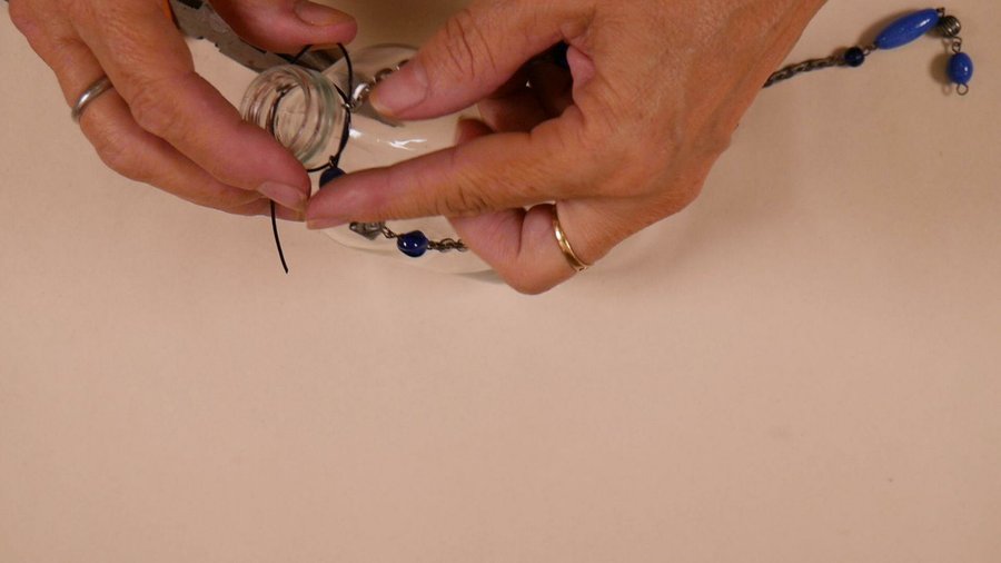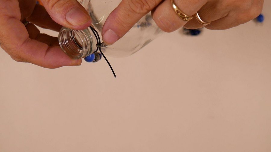 A uno de los alambres le realizo dos vueltas en el extremo y quedará así alrededor de la boca del frasco, paso por ambos rulos el otro alambre y lo sujeto igual que hice en los anteriores dejando 2 trozos libres a los que les voy a enhebrar 2 adornos que sujetaré doblando las puntas del alambre.