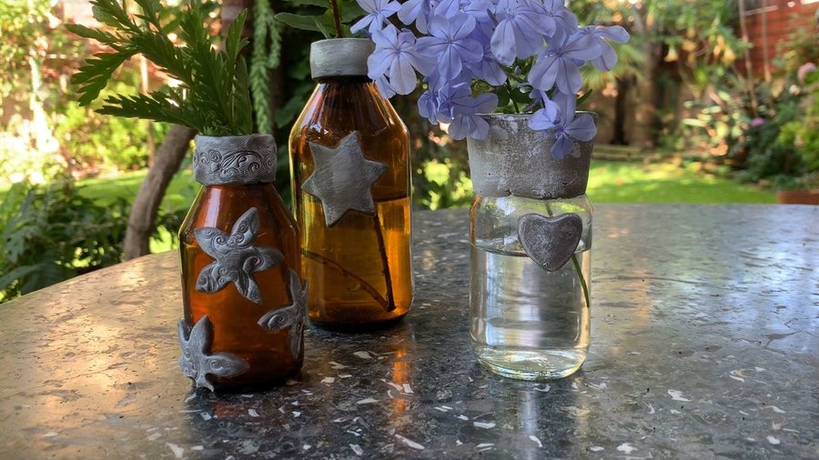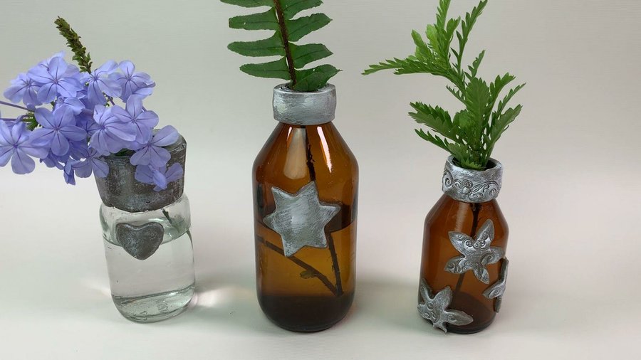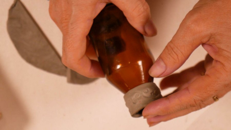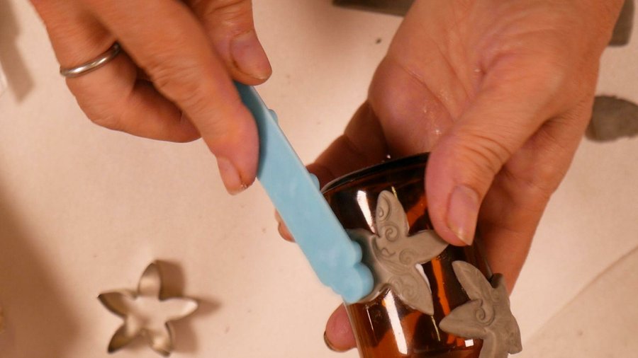 Con lo que quedó estirado y con cortante de galletitas lr sigo haciendo adornos que pego con cola vinílica al frasco y con el mismo sello presionando realizo los mismos adornos.