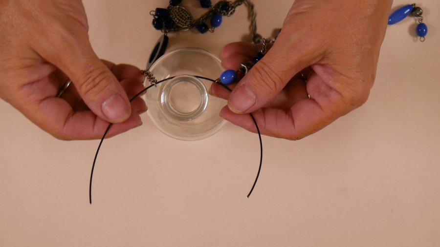 Enhebro las dos puntas del collar con el alambre y envuelvo el alambre alrededor del cuello, lo sujeto con una pinza retorciéndolo y vuelvo a enhebrar cada lado del collar con las puntas del alambre, quedando así bien firme y levanto estas dos puntas de alambre y en ellas enhebro cada una de las partes del collar que recorté y ayudada con una pinza realizo un rulito en casa extremo que servirá de contención y de adorno.