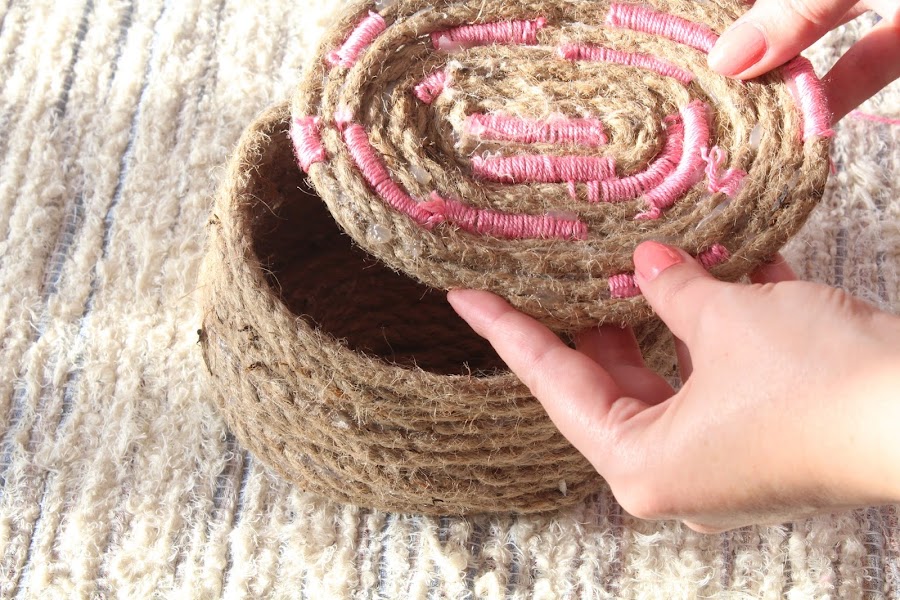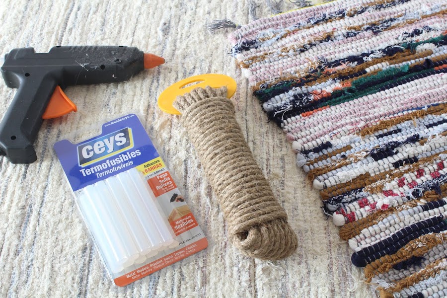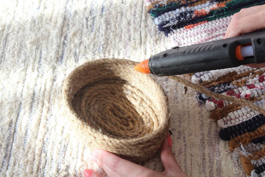 1 Paso: Crearemos la base del Cesto enroscando la cuerda y fijándola con silicona Caliente.