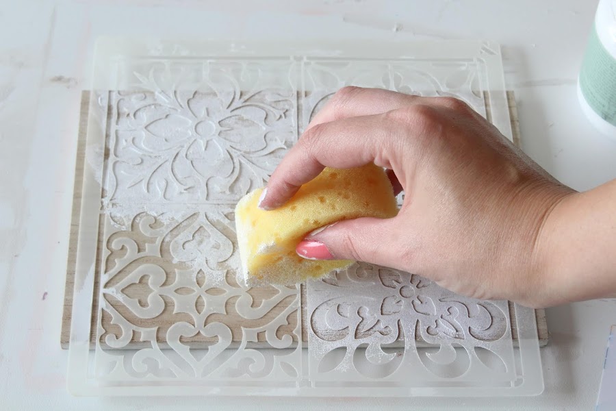 1 Paso: Colocamos el Stencil y con una esponja pintamos el motivo decorado.
