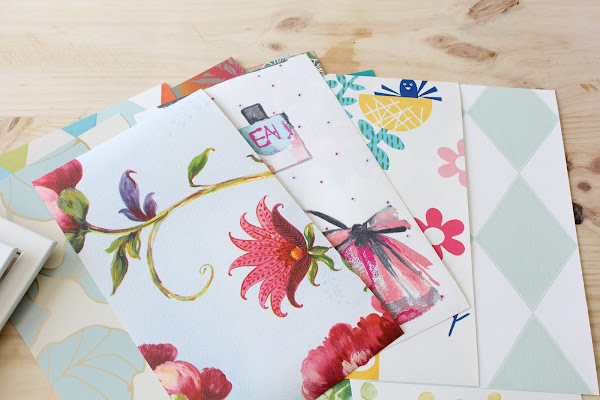 Tip: Utilizad varios retales de papeles que combinen en colores, recortar los trozos y crear varias composiciones.