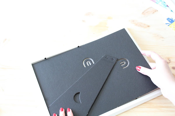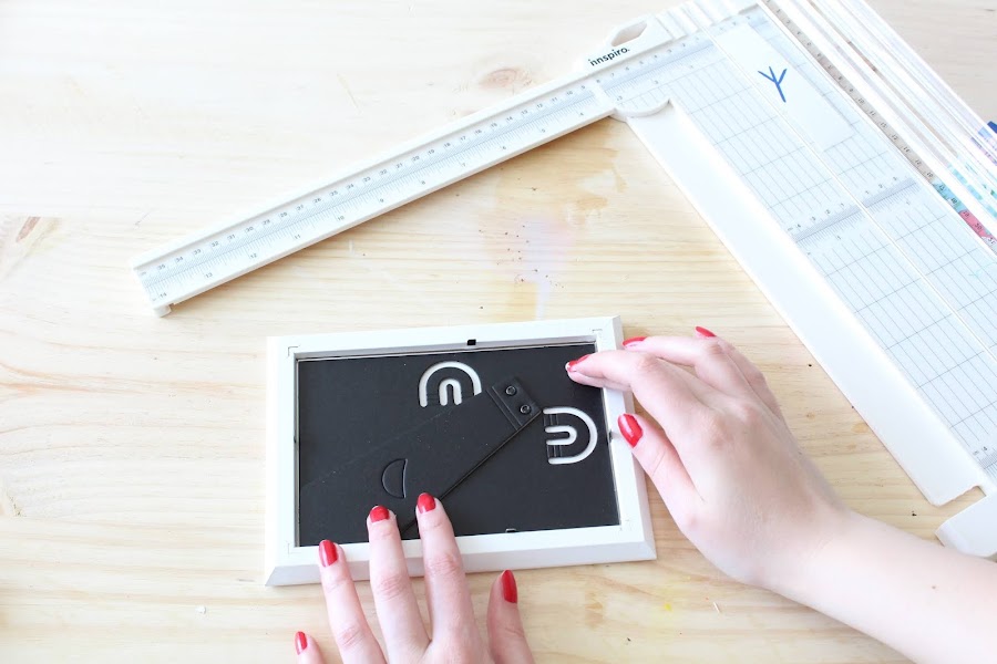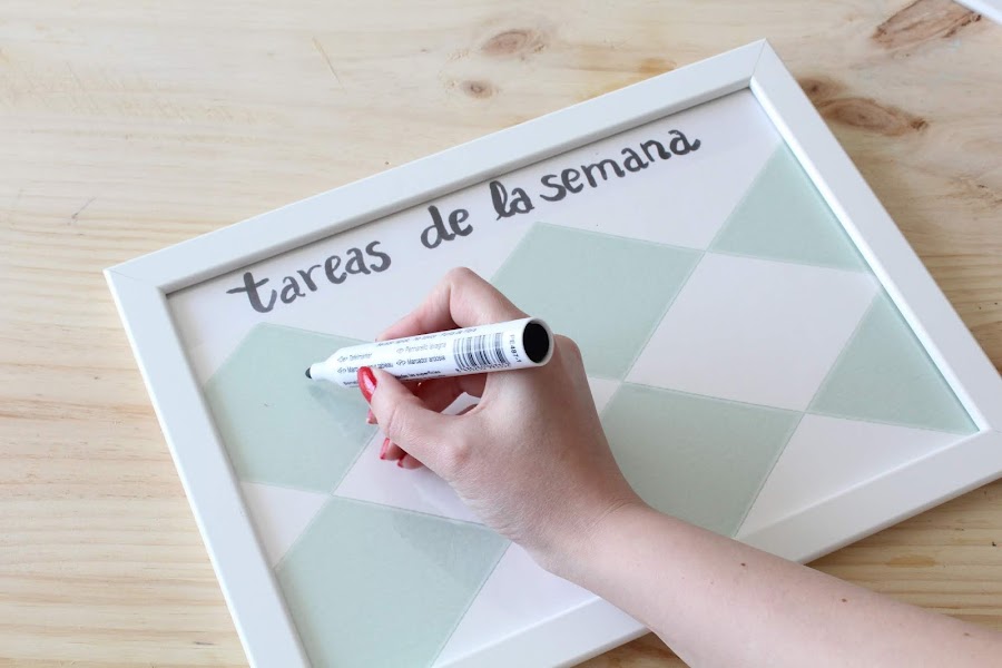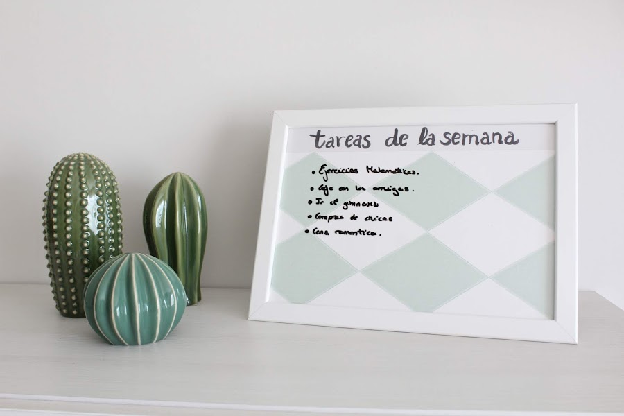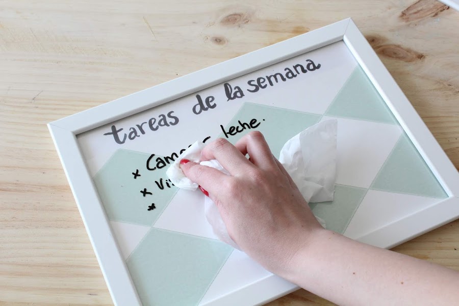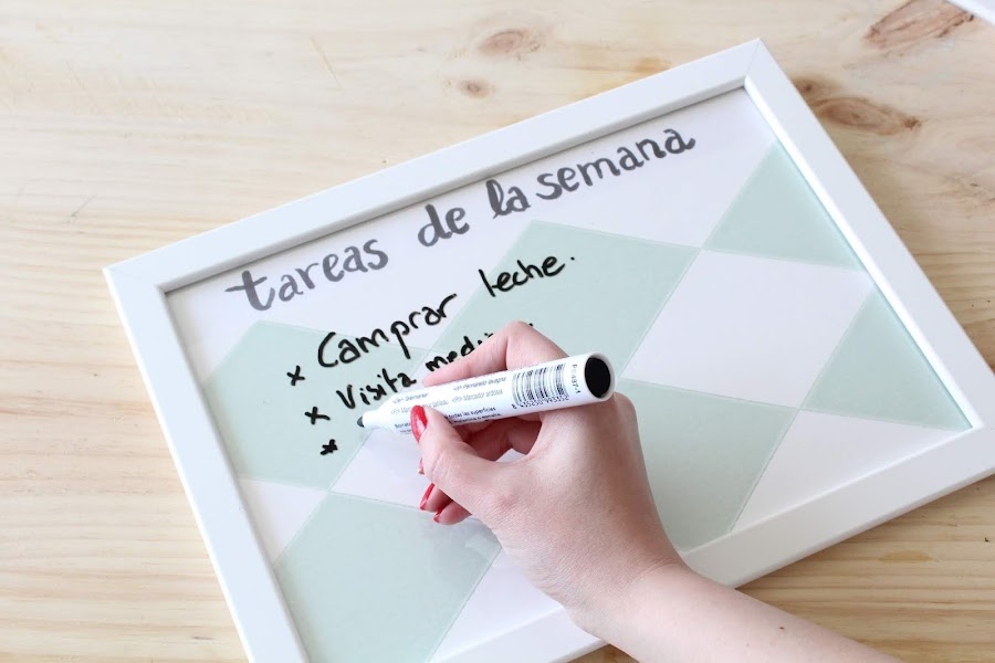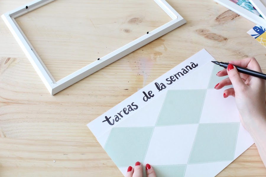 Esta segunda idea es sencilla y muy práctica. Se trata de utilizar un marco de fotos con un fondo de papel estampado para crear una bonita pizarra de tareas.Materiales