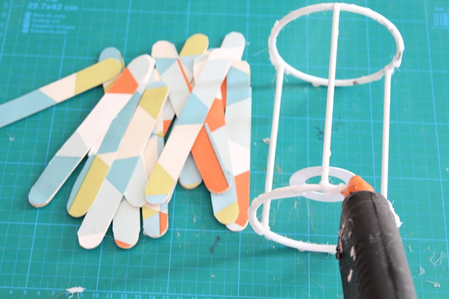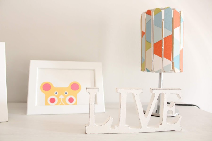 La ultima idea es la que más me gusta. Se trata de renovar una pantalla de lámpara con palitos de helados forrados con papel estampado. ¡No es difícil! Una idea DIY para reciclar nuestras viejas lámparas y traerlas de vuelta al siglo XXI, más divertidas y de forma muy económica.Materiales