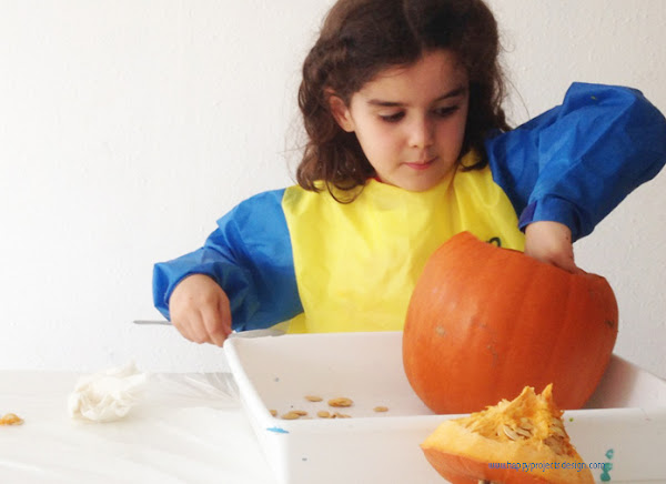 Crea un farolillo vaciando la calabaza. Ayuda a tu peque a cortar la parte superior y a vaciarla con la ayuda de una cuchara.