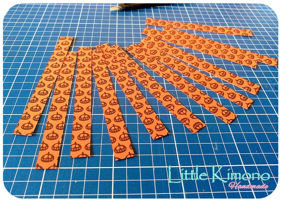 1. Yo usé media cartulina, pero si queréis podéis hacerla más grande. Cortamos tiras de 1,5cm.