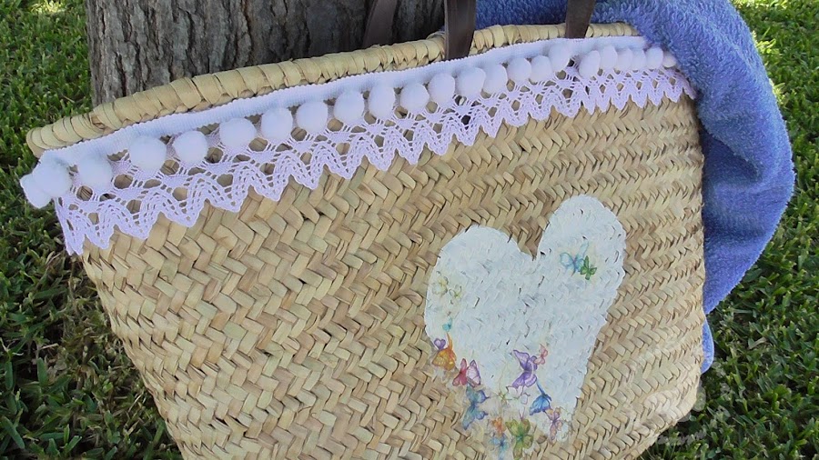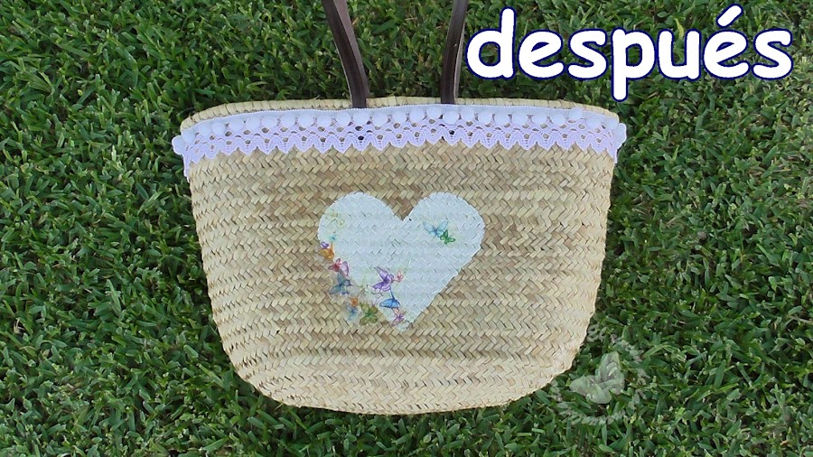 En la segunda idea utilizaremos la técnica del decoupage ayudándonos de una servilleta decorada, como no podía ser de otra manera........ de mariposas. Lo primero será recortar la servilleta con el motivo que queramos y solo utilizaremos la capa decorada de la servilleta. Aplicaremos cola blanca para pegarla, intentando que no se nos arrugue. Para fijarla al capazo, tanto en la primera idea como en esta, utilizaremos un barniz al agua. Aquí os dejo el enlace a otro trabajo de decoupage, convirtiendo un salvamanteles en un Organizador de brochas.