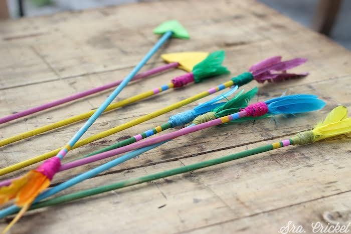Las flechas las puedes hacer con pajitas largas de diferentes colores o palillos chinos, plumas y cartulina para las puntas. Puedes ver cómo se hacen en el vídeo tutorial.