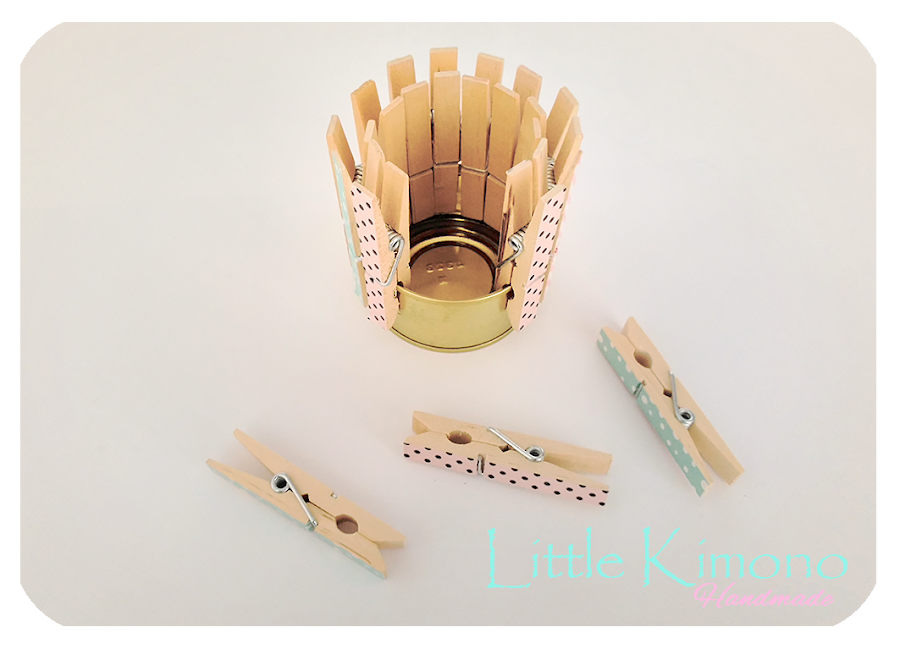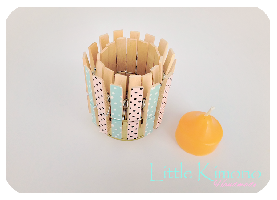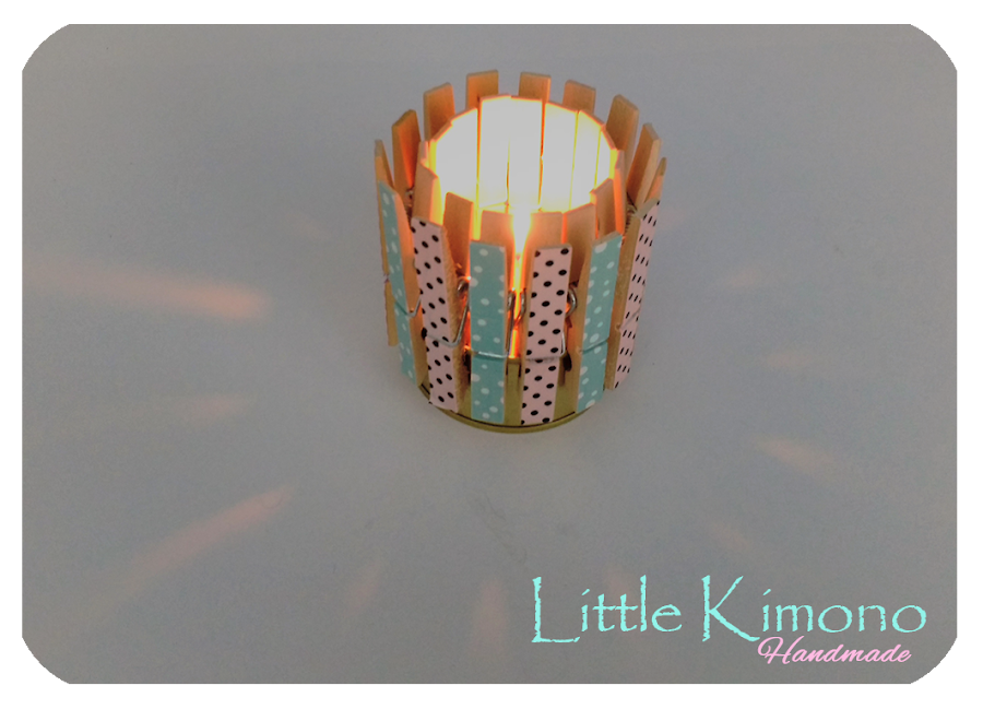Colocaremos todas las pinzas alrededor de la lata. Por último colocaremos nuestra vela. Y voilà! Tenemos nuestro portavelas con materiales reciclados ◠‿◠