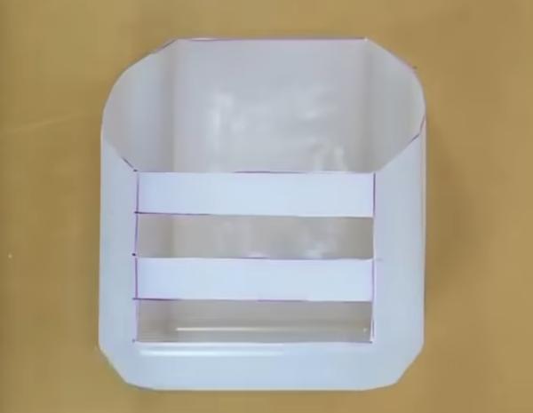 La parte de atrás dejar el total del alto del bidón y llevar una línea desde la parte de atrás hacia adelante y cortar (ver vídeo)