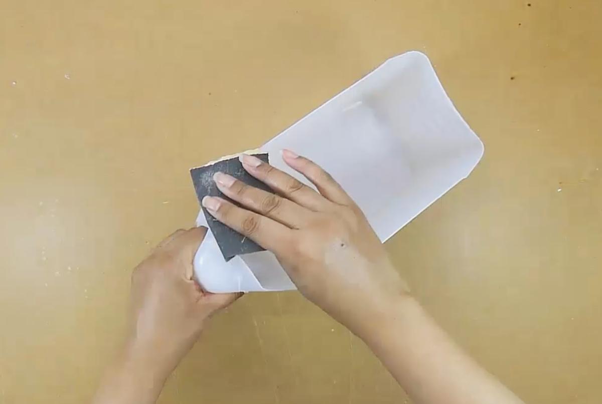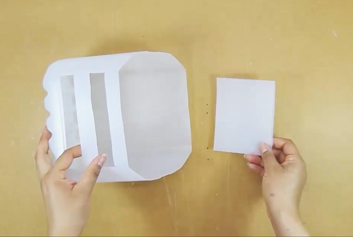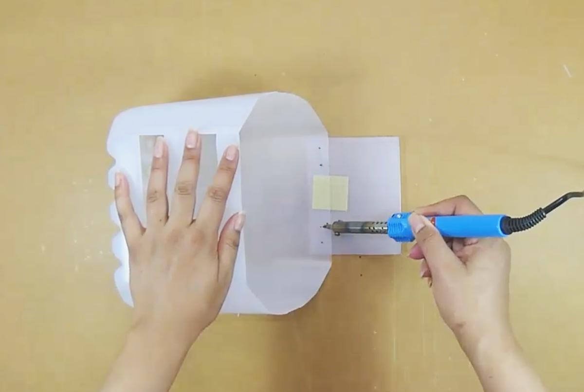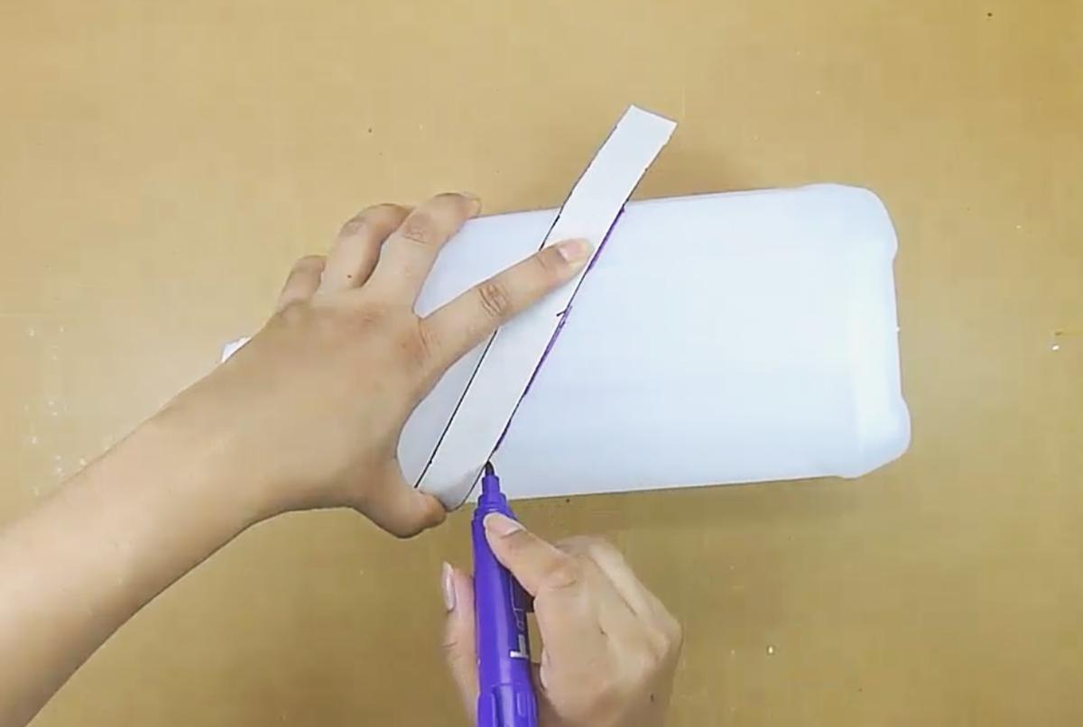 Corta dos trozos de plástico de los restos del bidón en forma de rectángulos, aprovechando todo el espacio posible