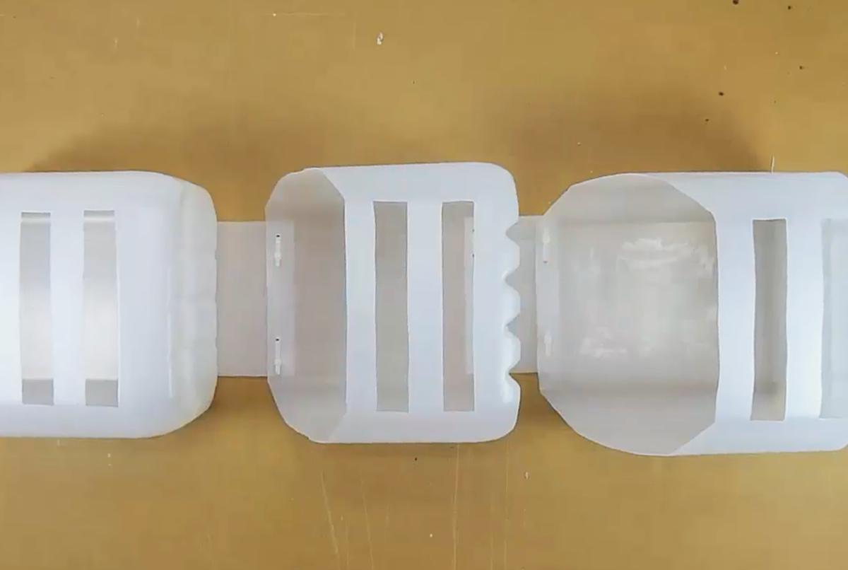 Añade los dos rectángulos entre los tres bidones con ayuda de unas bridas o cinchos, recorta el restante de las bridas y quema con el cauting, para redondear.