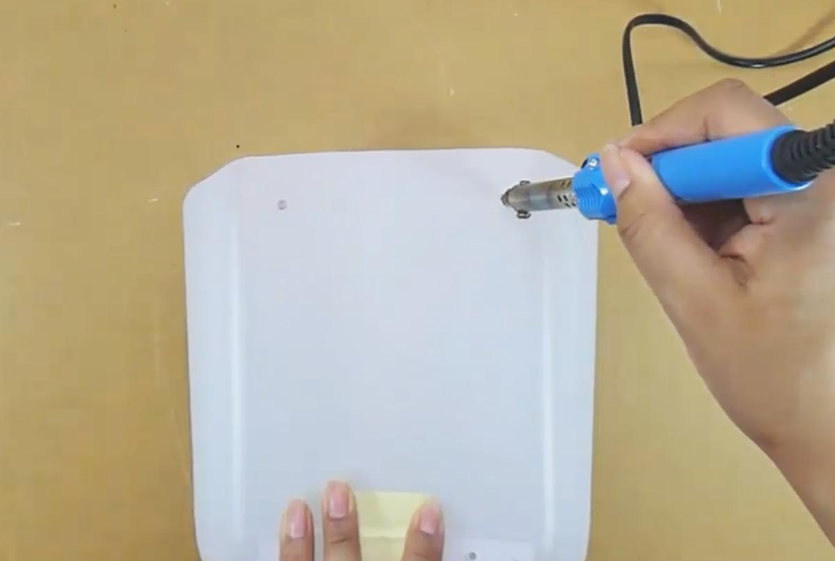 Fija con un trozo de cinta de carrocero el rectángulo debajo de la parte posterior, haciendo que se entrecrucen un poco, marcar y perforar con el cautín.
