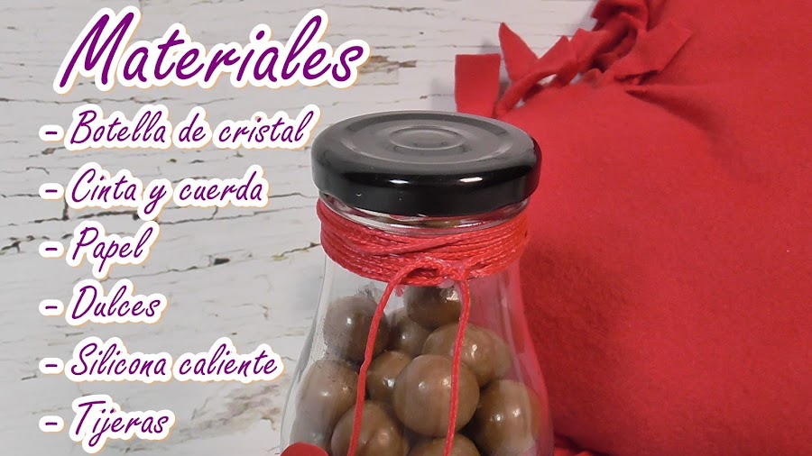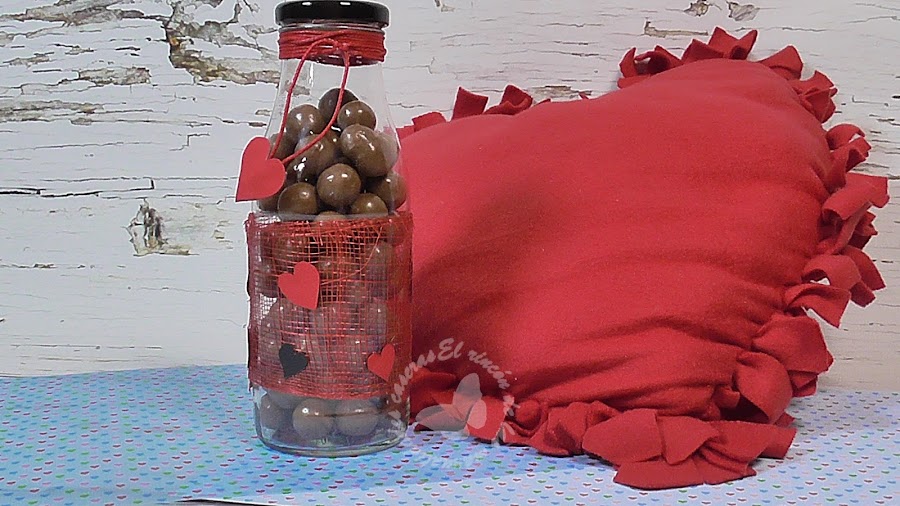 Rodearemos la botella con una cinta decorativa pegándola con silicona caliente y le añadiremos unos corazones de cartulina, y en el cuello de la botella le liaremos una cuerda rematándola con otro corazón y ahora lo mejor le introduciremos unos dulces y ya está lista la primera idea. Fácil y rápida ¿verdad?.