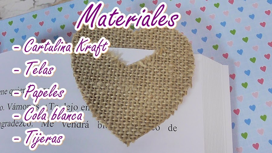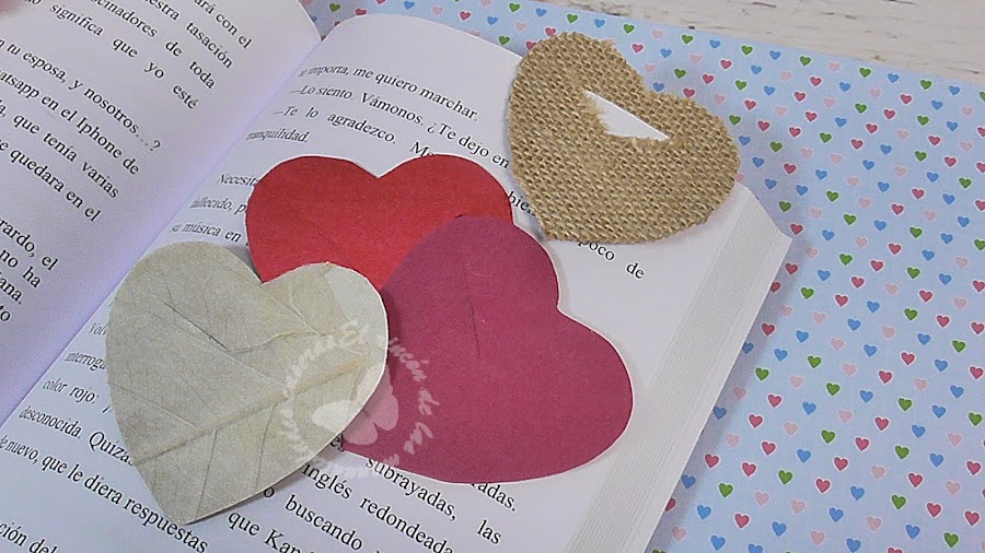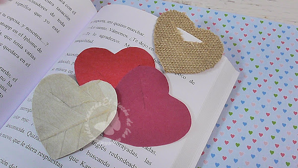 Esta es la más fácil de las tres, recortaremos en cartulina Kraft o cartón de caja de cereales y galletas, unos corazones que forraremos solo por una parte con tela, papel de regalo o cartulinas con cola blanca y por la parte de detrás le escribiremos una frase que queramos decirle a la persona que se lo vayamos a regalar, en el centro le cortaremos con cúter un piquito para poderlo poner en nuestras páginas del libro y ya está, un perfecto regalo para los amantes de la lectura.
