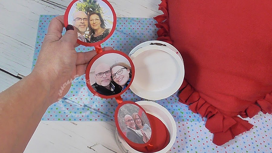 Necesitaremos una cajita de madera como la mía, o de cartón, eso no importa. Recortaremos unos círculos de cartulina y las fotografías y las pegaremos entre sí, les añadiremos una cinta pegándolos por la parte de atrás dejando un cm de distancia entre las fotos.