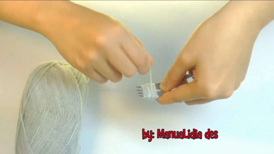 A continuación empezamos a enrollar la lana sobre los dientes del tenedor.