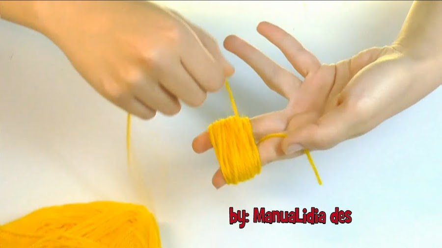 Para elavorar los pompones de esta manera sólo tienes que ir enrollando la lana sobre tu dedo indice y el corazón, y cuando tengas una cantidad suficiente enrollada en los dedos, con un trozo de lana, ata fuertemente el ovillo.