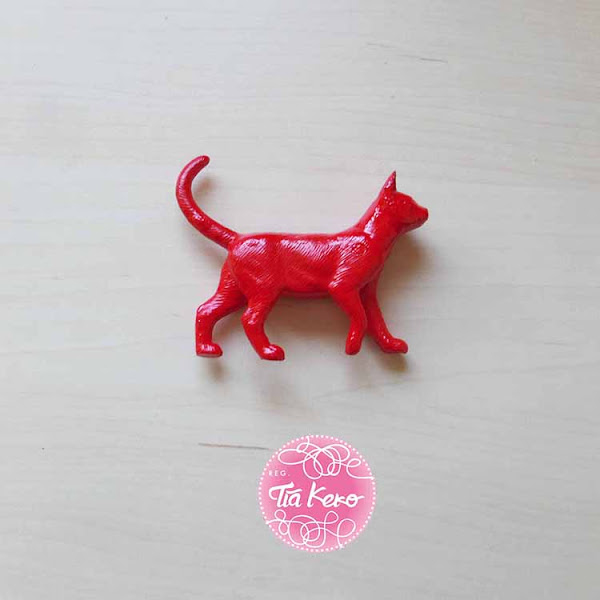 Para esta manualidad tan sencilla lo primero que haremos será pintar el gatito de plástico de color con pintura en spray, noostras elegimos el color rojo porque nos gusta un montón, de hecho, es mi color favorito y las niñas de vez en cuando me dejan usarlo, jajaja.