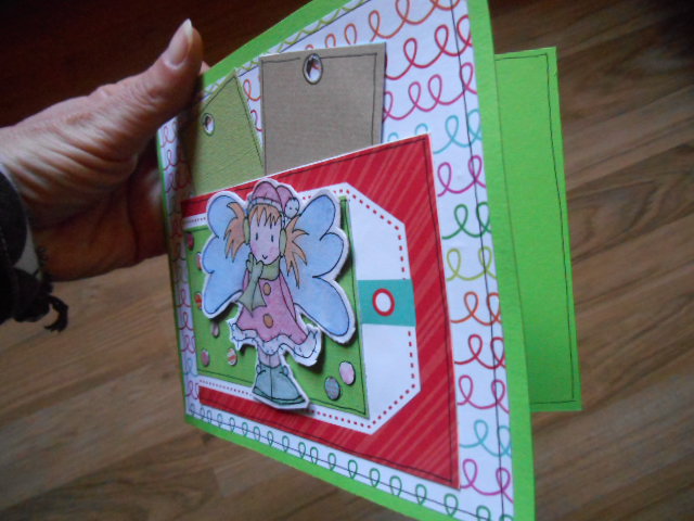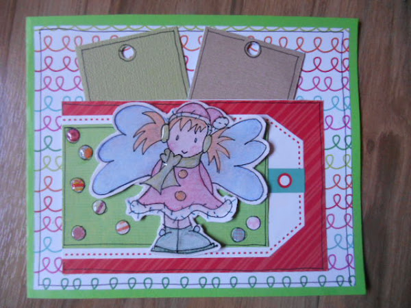 En mi tarjeta he incluidoel rojo el verde y algún colorín más, un par de tags, una angelita y unos copitos de nieve de colorines con glossy accents, para que quede más brillantita la tarjeta.