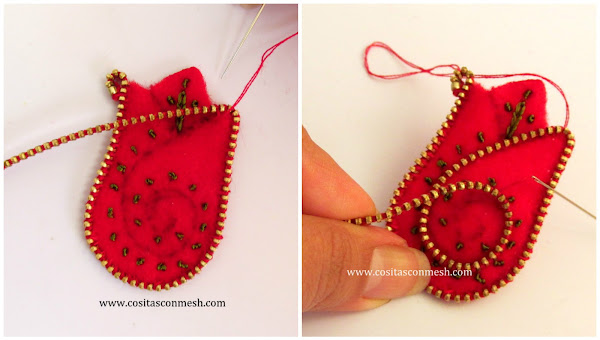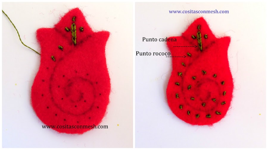 6.- Comienza a coser con hilo rojo desde la puntita izquierda de la rosa, haremos una gasita y continuamos cosiendolo hasta llegar al espiral de la rosa que esta dibujado.