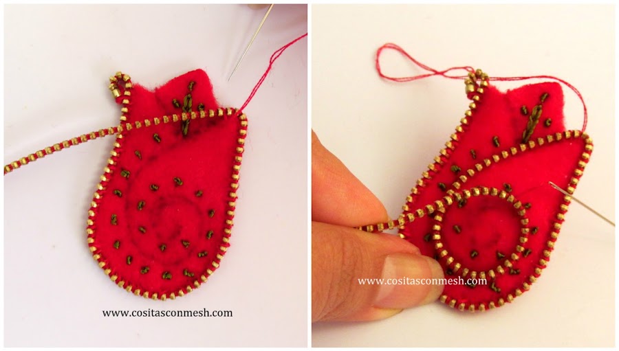 9.- Borda las hojas de la flor, haz cadenitas o la puntada que más te guste, con silicón liquido, pega las hojas detrás del tallo.