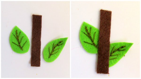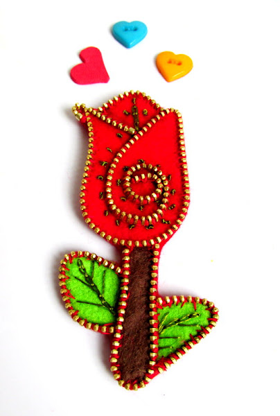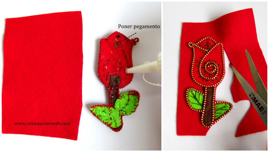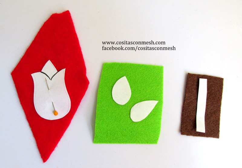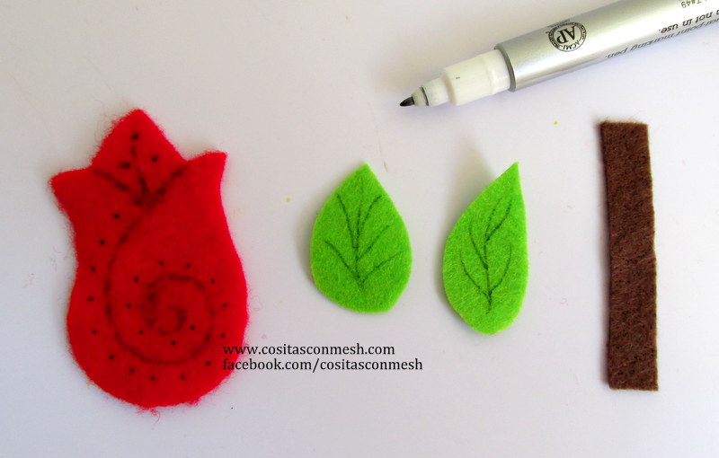 Usa fieltro rojo para hacer la rosa, las hojas irán en fieltro verde, el tallo en fieltro marrón.