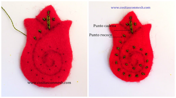 7.- El cierre irá cosido en todo el contorno de la flor de fieltro, hasta llegar al espiral que dibujamos dentro de la rosa.