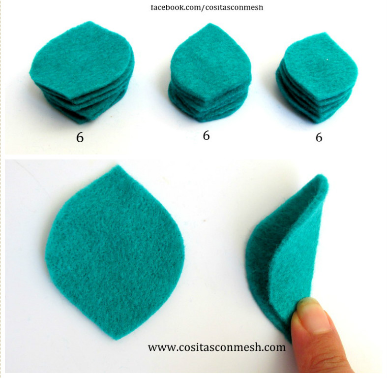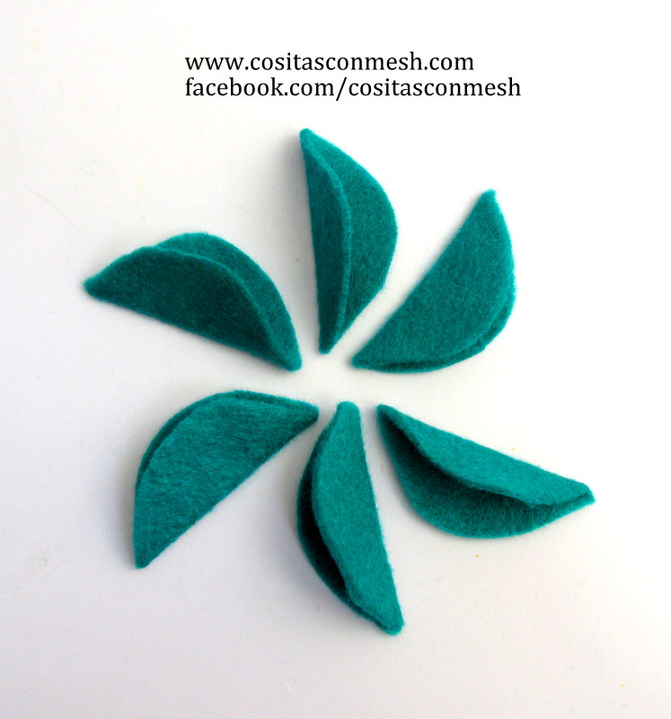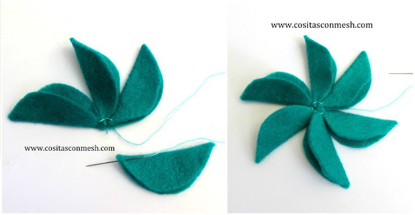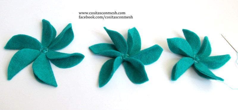 10.- Pongo las 6 hojas más grandes primero, luego las medianas y las pequeñas, los coso desde el medio con un hilo del mismo color del fieltro.