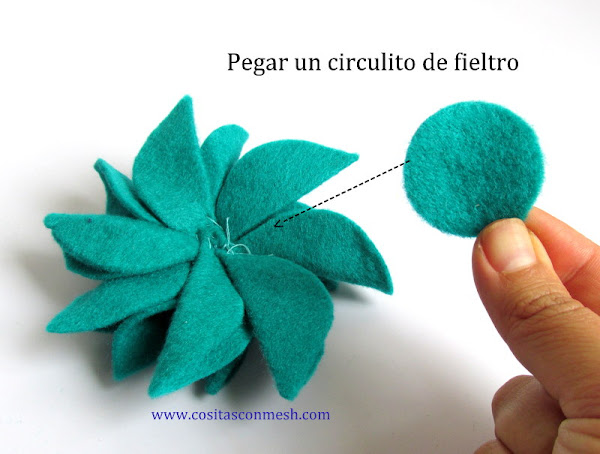 11.- Ya que esta todo bien cosidito, en la parte trasera de la flor pegare un circulito de fieltro y así quedara cubierto todo lo que cosí.