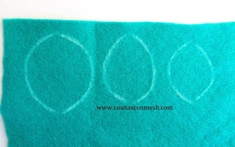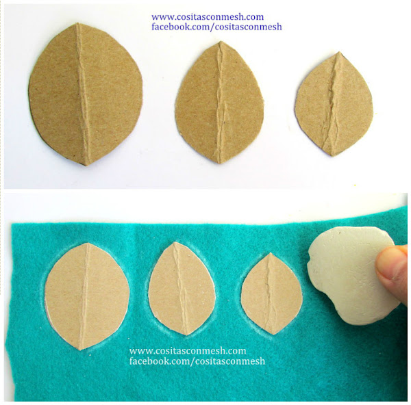 3.- Ponemos los moldes sobre el fieltro, y con un gis dibujamos todas las hojas.
