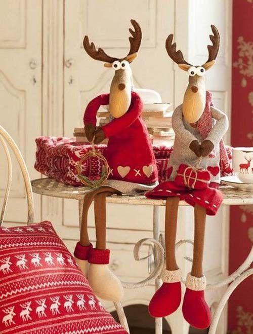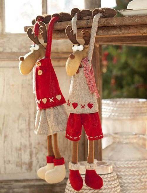 Los renos también están de moda y son perfectos para decorar cualquier habitación o rincón. Los pasos a seguir son los mismos y los materiales que necesitas son fieltro de varios colores (blanco, negro, rojo y diferentes tonos de marrón), algodón, tijeras, aguja e hilo y un lazo decorativo. Para hacer esta figura dibuja su contorno dos veces y córtalos. Introduce algodón para que adquiera volumen y cose ambas partes. Dibuja ojos, una nariz (en su lugar puedes utilizar un botón rojo) y unos cuernos y pégalos o cóselos en tu reno. Para finalizar, coloca una cinta decorativa en la parte superior para colgarlo.
