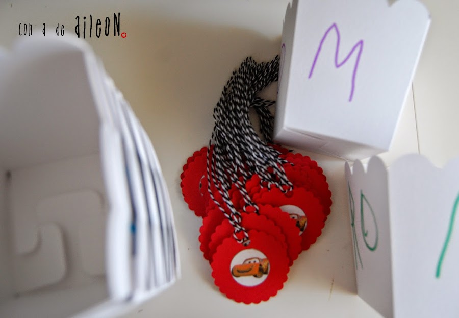 Despues solo tuvimos que meter las chuches, usar una bolsa de plastico transparente y cerrar con un cordel negro y blanco (simulando las banderas de meta), troquel y una pegatina de cars, de RayoMcQueen. Así poco a poco el niño va aprendiendo a tener paciencia, jeje.