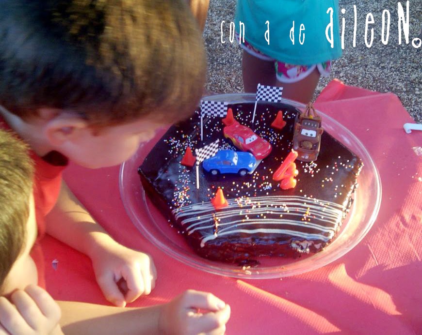 Y la tarta simplemente la adorné con unos coches y banderitas compradas (lo reconozco, ya no daba para más) ;D