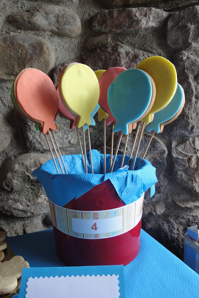 Hice galletas con forma de casa, de nubes y de globos, que decoré con fondant y les añadí el palito para hacerlas piruletas, volaron, a los niños les encantaron estas galletas-palo.