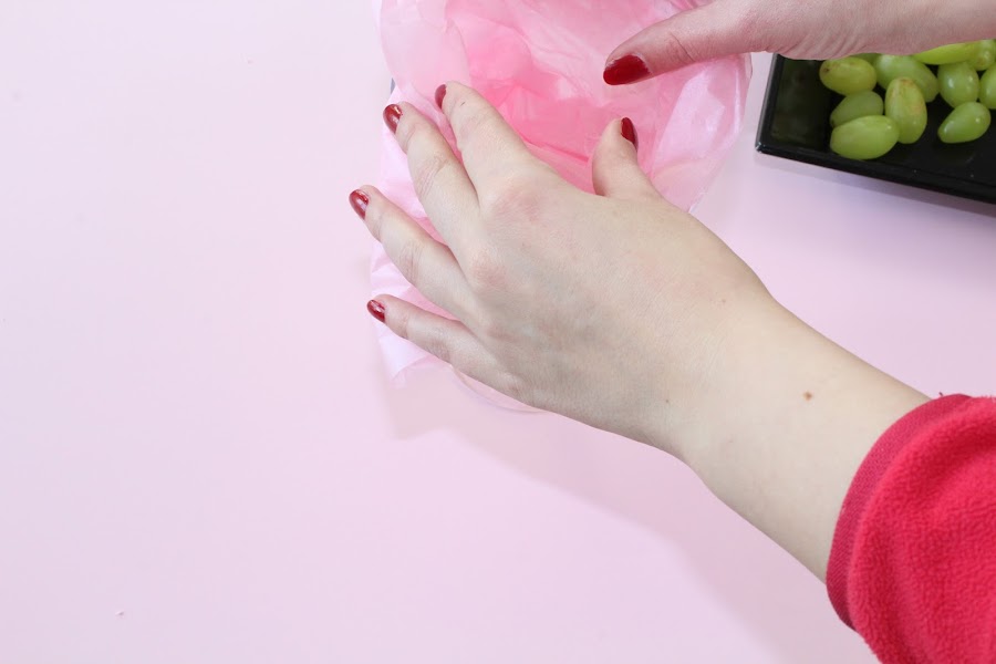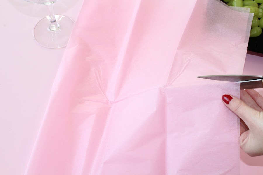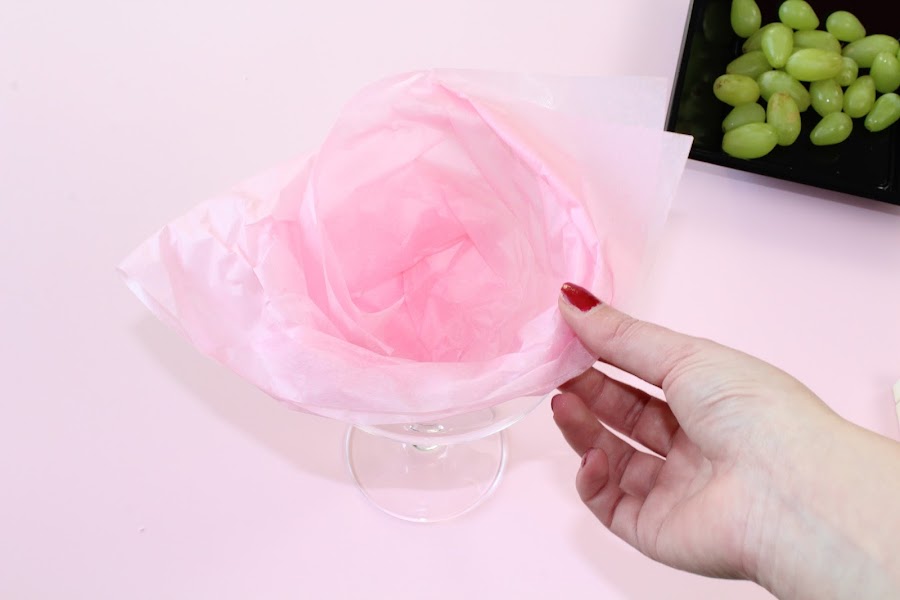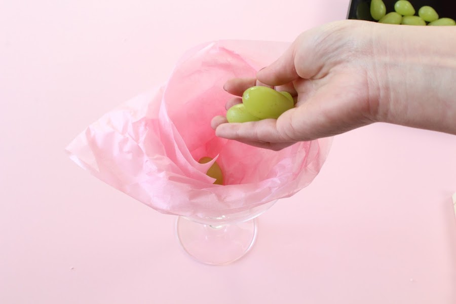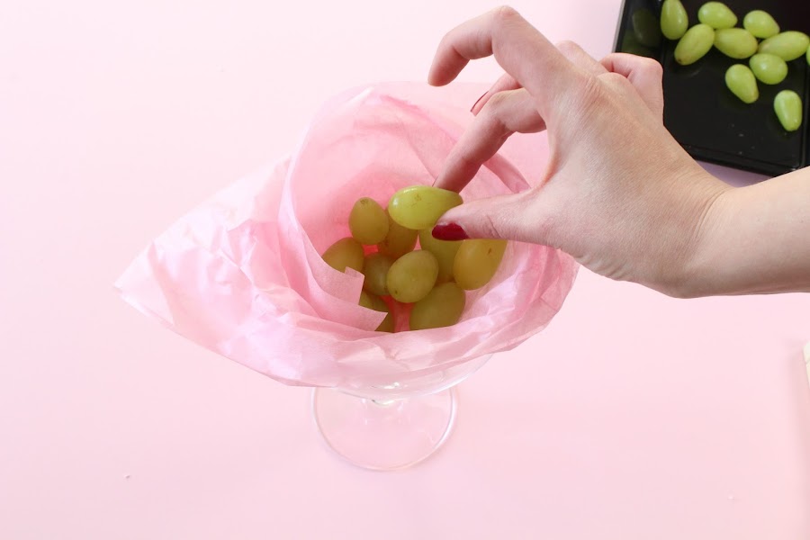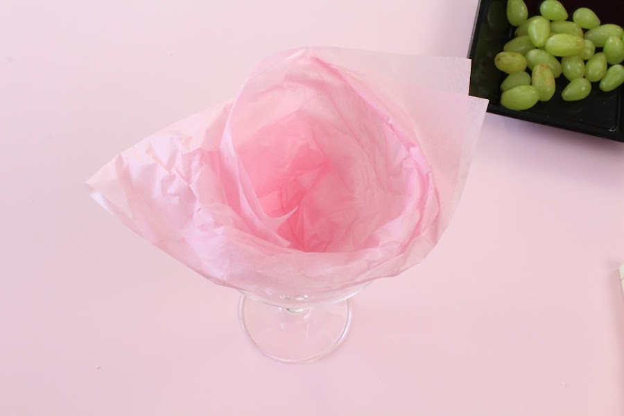 Cortamos un cuadrado de papel de seda, con el hacemos un cono. Lo ponemos en una copa de cristal y lo rellenamos con las 12 uvas.