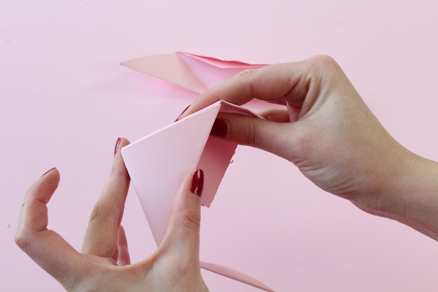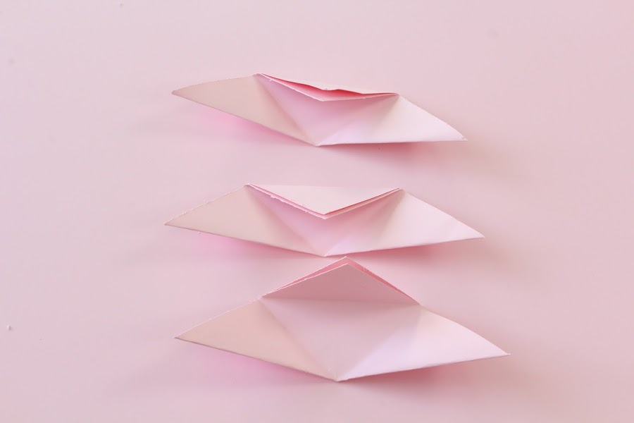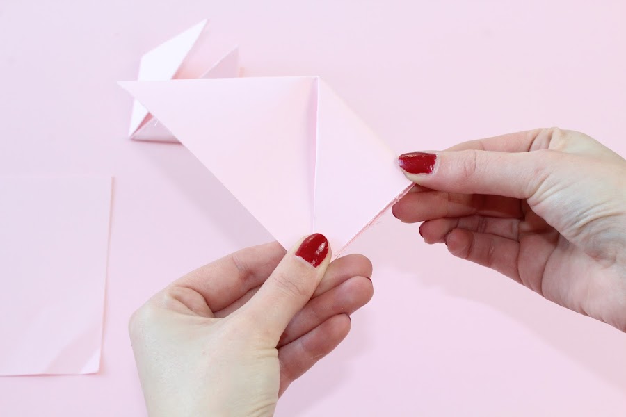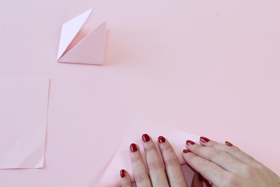 Doblamos el cuadrado por la mitad, creando un triangulo. Cogemos uno de los extremos del triangulo y lo unimos ala punta inferior, repetimos con el lado opuesto. Abrimos, ahora cogemos la punta inferior y la subimos marcando la doblez. Repetimos el proceso con los dos cuadrados restantes.