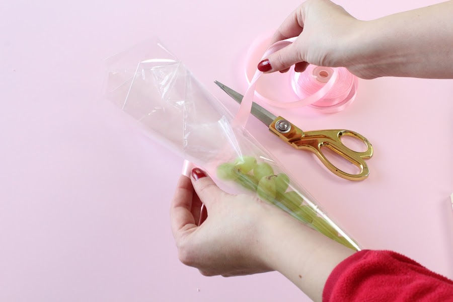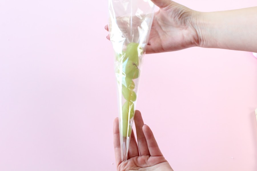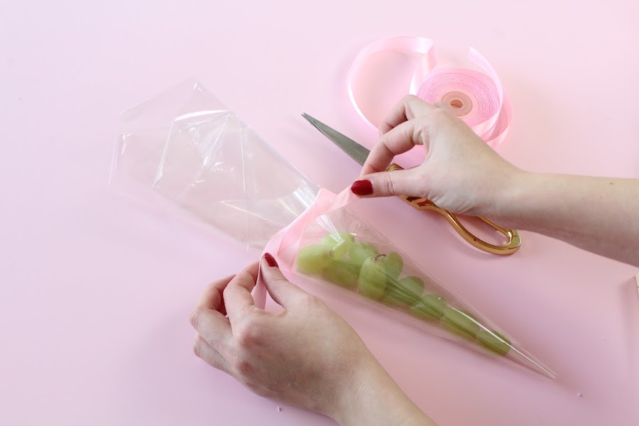 Recortamos un rectángulo de papel de celofán, lo enrollamos en forma de cucurucho. rellenamos con las 12 Uvas y cerramos con una cinta haciendo un lazo.