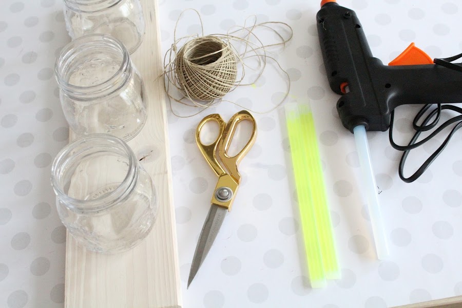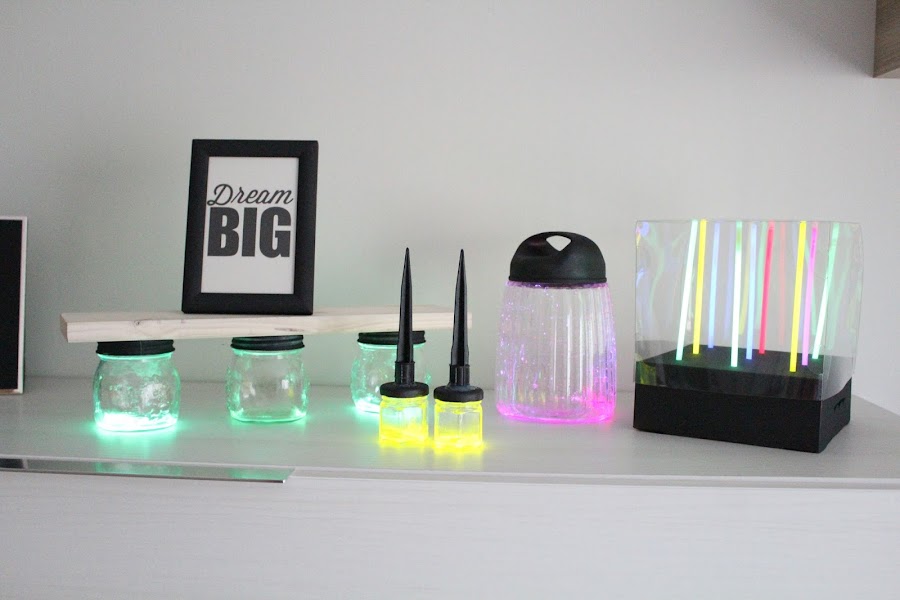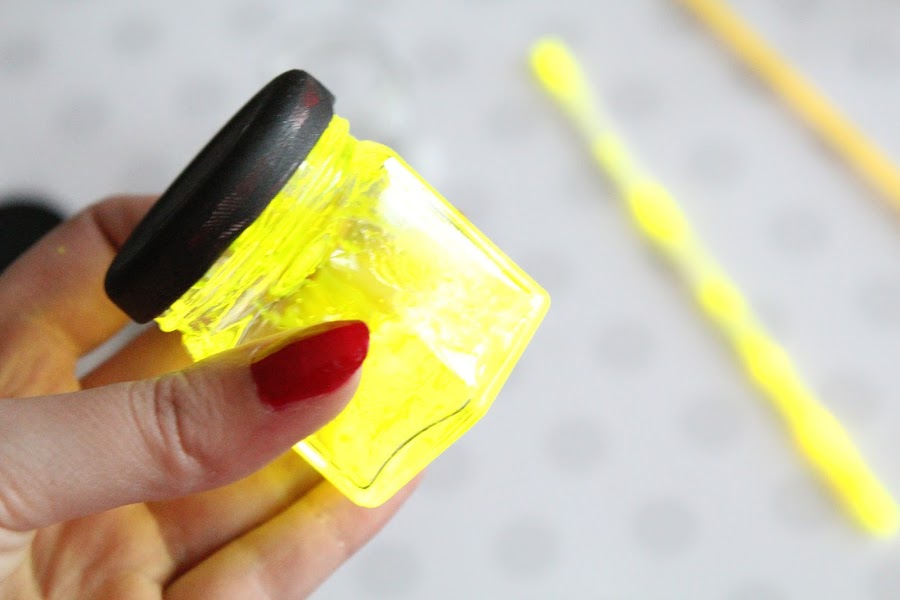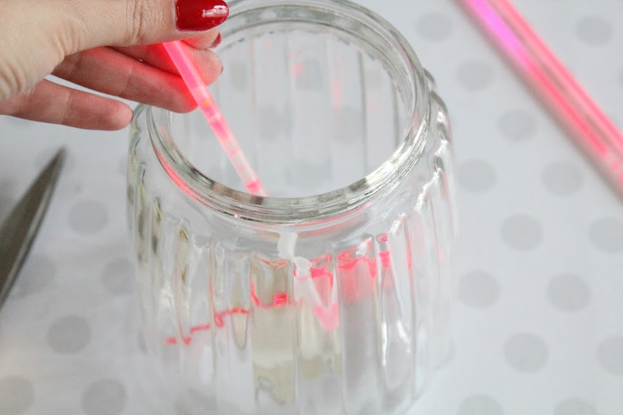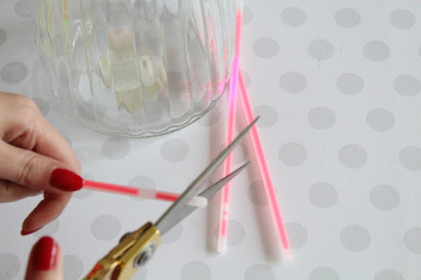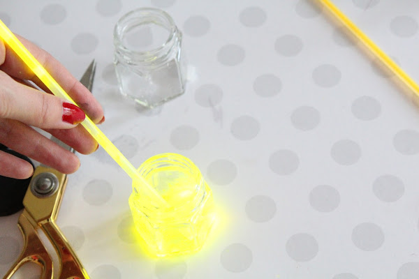 1 Paso: Cortamos con cuidado un extremo de un pulsera y con cuidado vertemos el contenido en los botes. Tapamos y agitamos.