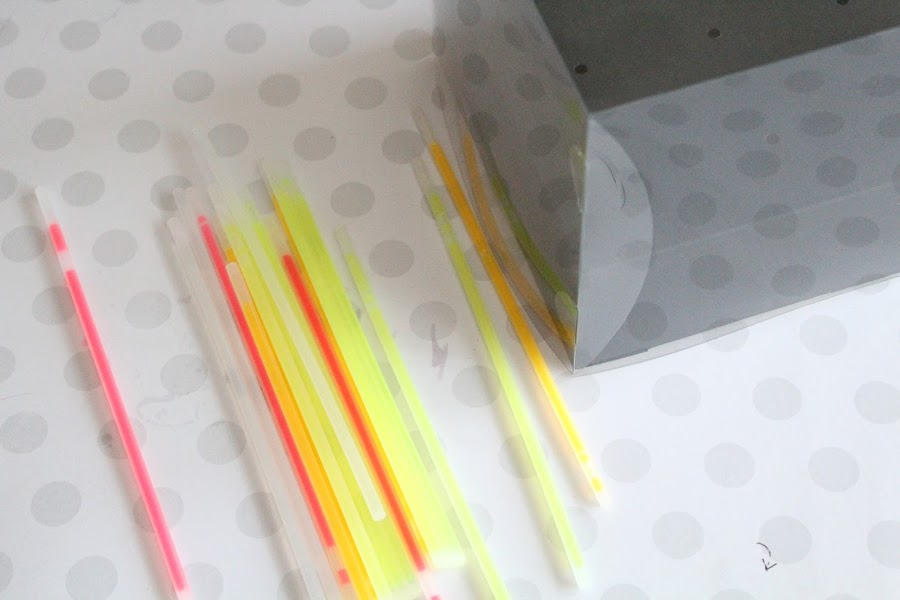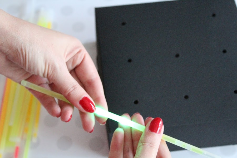 1 Paso: Pintamos la base de la caja de Pop Cakes, podes encontrar este modelo en Selfpackaging del color que más nos guste y a continuación vamos doblando poco a poco los palitos de Glow, hasta que estén bien iluminados.