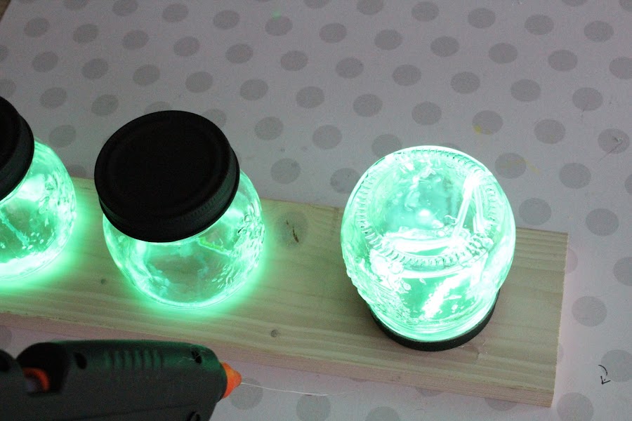 2 Paso: Pegamos con silicona los botes a la madera, podemos ponerlo de dos maneras : con las tapas hacia arriba o hacia abajo.