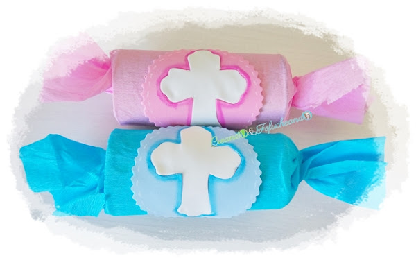 Este caramelito podemos decorarlo por ejemplo con una cruz que recortaremos y acoplaremos en un circulito chachi al que le podemos dar vidilla con los pinceles.