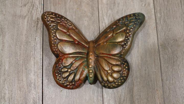 A tu pintura rojo oxido agregale tantita agua paraque a la hora de que la apliques corra con mayor facilidad, ahora el rojo oxido va a ir en algunas partes de la parte central de la mariposa, luego agrega el ocre en otras partes, en oras partes aplica el verde jade y finalmente retira la pintura con un pedazo de servilleta o con untrapito.