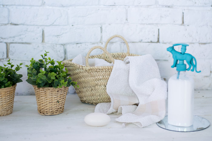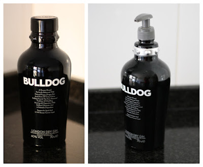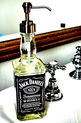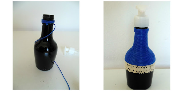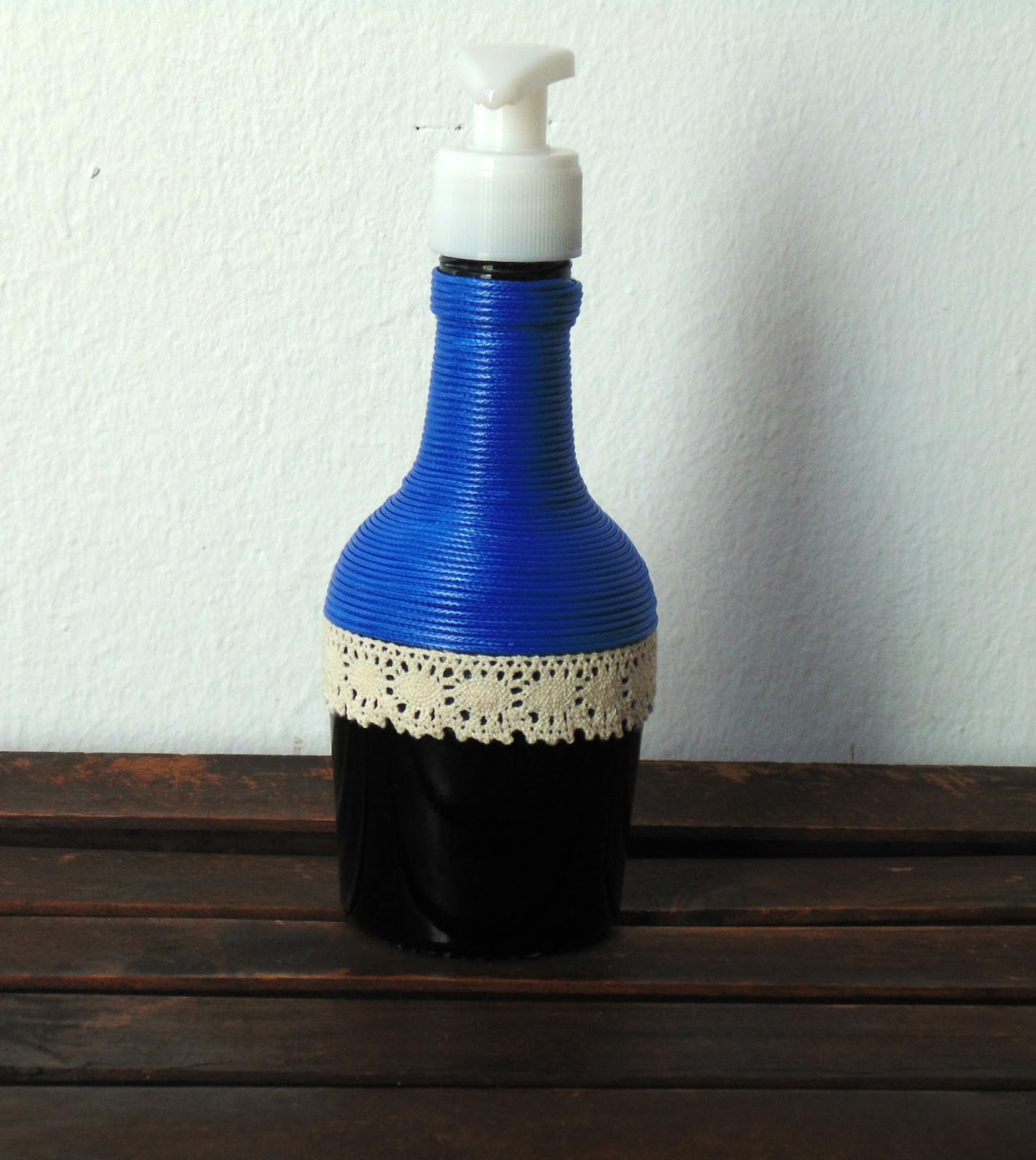 He utilizado una botella de licor de whisky, el dispensador fue reciclado de un bote de otro jabón. Lo que hice fue comprar la cuerdecita azul.