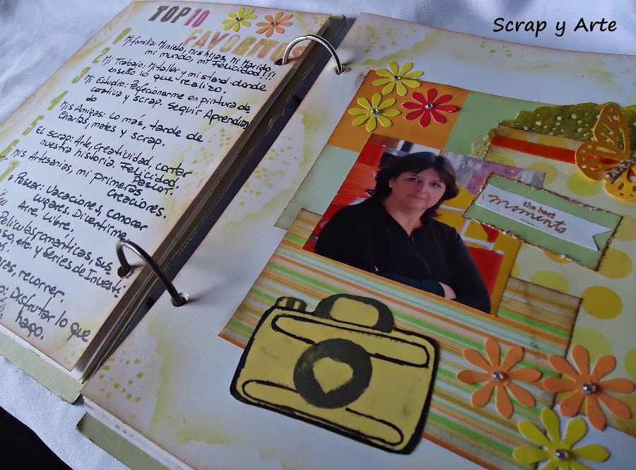 Aplique mi foto sobre diferentes papeles de colores, una frase sobre una tirita de papel que dice "Los Mejores Momentos", un pedacito de blonda de color verde (esta entintada) ya que la use como stensil en la hoja, cinta, mariposa, flores y una cámara de foto (es un sello que realice Yo)